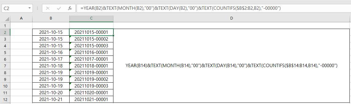 =YEAR(B14)&TEXT(MONTH(B14),"00")&TEXT(DAY(B14),"00")&TEXT(COUNTIFS($B$14:B14,B14),"-00000")